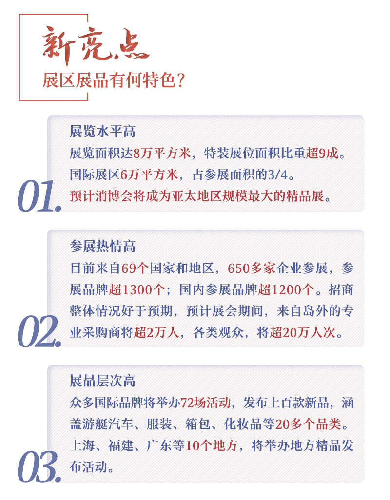 ??? 本屆中國國際消費品博覽會規模盛大,立志于打造亞太地區規模最大的精品展。空前的規模吸引了來自69個國家和地區的650多家企業參展,參展品牌超1300個,其中國內參展品牌超1200個。從服飾箱包到美妝精品,從珠寶鉆石到游艇汽車,將有上百款消費精品首發首秀。