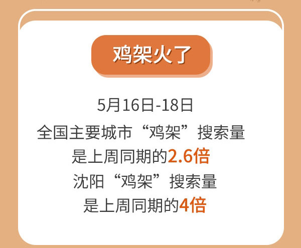 ????? 所謂雞架,就是整只雞去掉雞腿、雞爪、雞胸等剩下的骨架,然后運(yùn)用水煮、烤、炸、熏、炒等多種烹飪手法,讓雞架變得有滋有味。 5月16日-18日,隨著“雞架”一詞的出圈,全國主要城市雞架”搜索量明顯攀升,其中“沈陽雞架”的搜索量是上周同期的四倍。