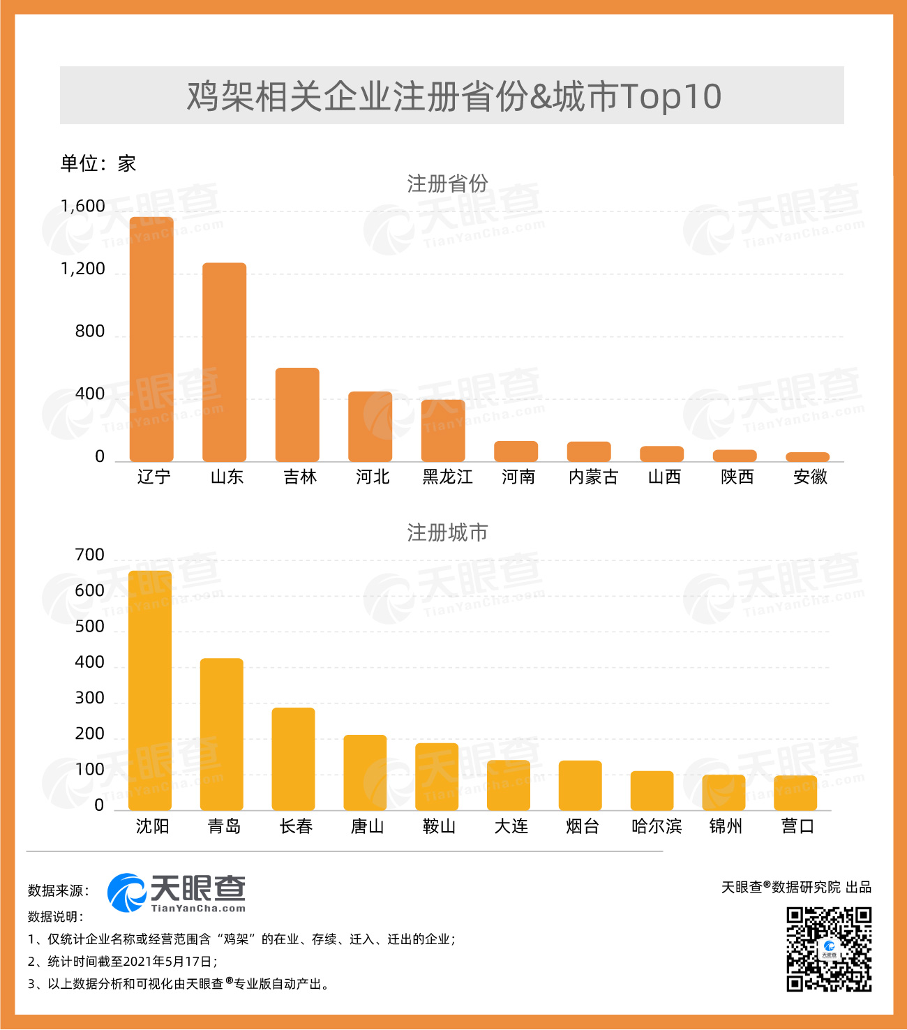 ????? 從地域分布上看,遼寧的雞架相關(guān)企業(yè)數(shù)量最多,有近1,600家,占全國近3成。其次為山東,有1,200余家雞架相關(guān)企業(yè)。分城市來看,沈陽以670余家雞架相關(guān)企業(yè)位居全國首位,其次為青島,有400余家相關(guān)企業(yè)。天眼查數(shù)據(jù)顯示,近年來我國雞架相關(guān)企業(yè)年注冊量整體呈現(xiàn)上漲趨勢。2019年,我國新增2,200余家雞架相關(guān)企業(yè),年注冊量達(dá)到歷史最高。2020年,我國新增近2,000家雞架相關(guān)企業(yè)。