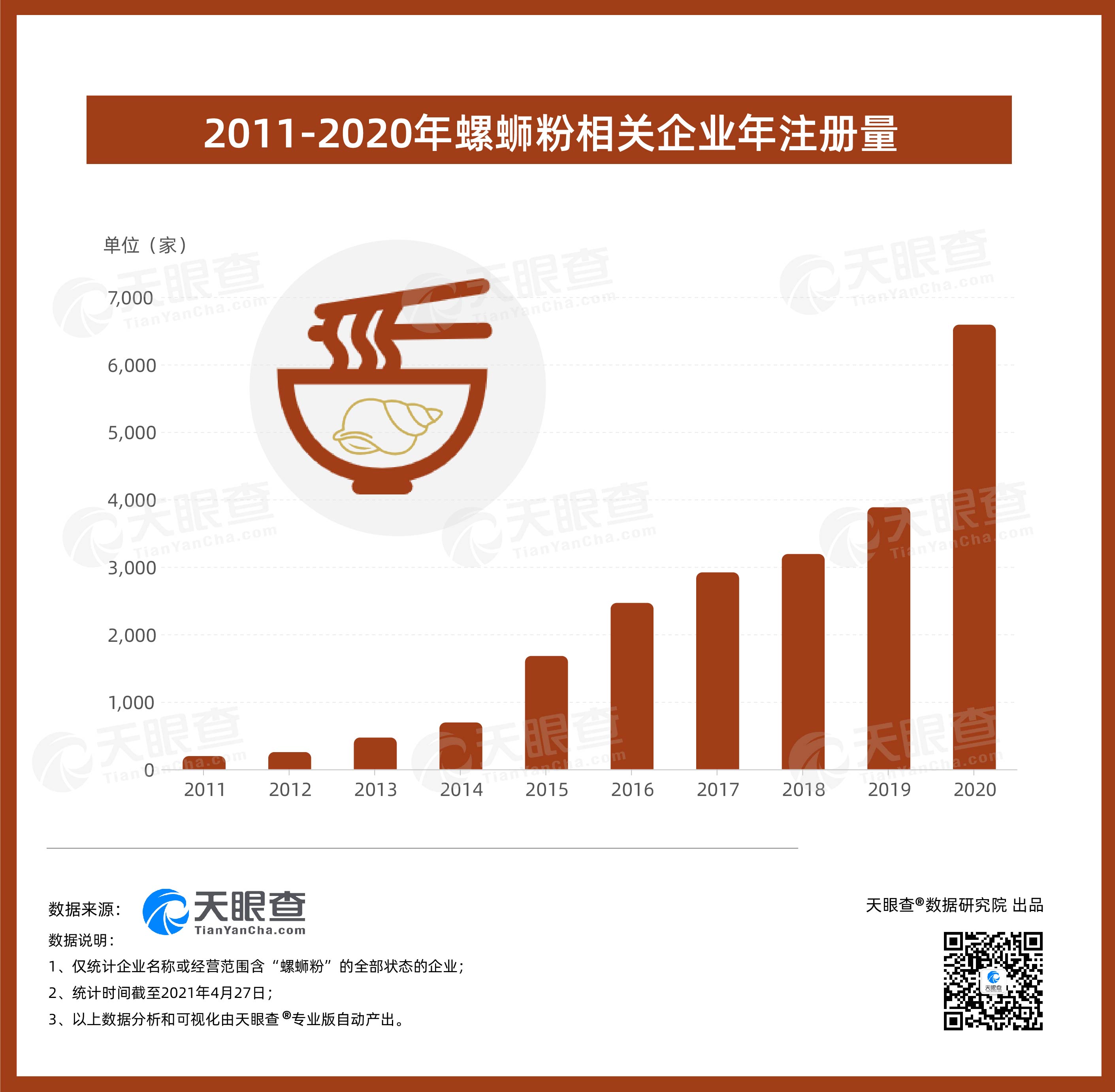????? 從地區(qū)分布來看,廣西的螺螄粉相關(guān)企業(yè)數(shù)量最多,超過5,300家。其中,柳州市擁有超過1100家螺螄粉相關(guān)企業(yè),占全國的6%。此外,廣東以超4,800家相關(guān)企業(yè)數(shù)量位居第二,河南和湖南也分別有超過1,000家相關(guān)企業(yè)。值得一提的是,近五年來,我國螺螄粉相關(guān)企業(yè)(全部企業(yè)狀態(tài))年注冊量整體呈現(xiàn)上漲趨勢,年增速保持在30%以上。其中,2020年新增相關(guān)企業(yè)數(shù)量最多,超過6,500家,同比增長70%。