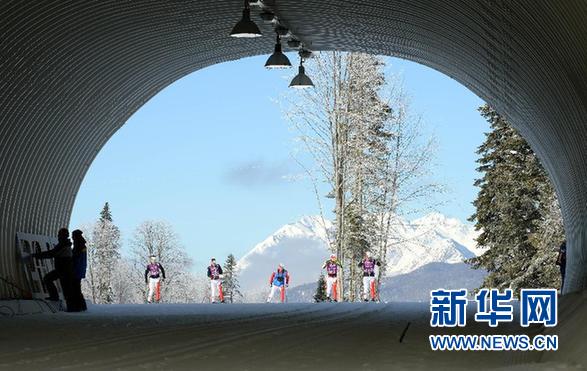 ????資料圖片:2月5日,運動員在訓練時穿過賽場的一處隧道。當日,各隊運動員來到索契雪上賽區勞拉越野滑雪和冬季兩項中心進行適應性訓練,以備戰8日在這里開始的冬奧會越野滑雪比賽。 新華社記者 王松 攝
