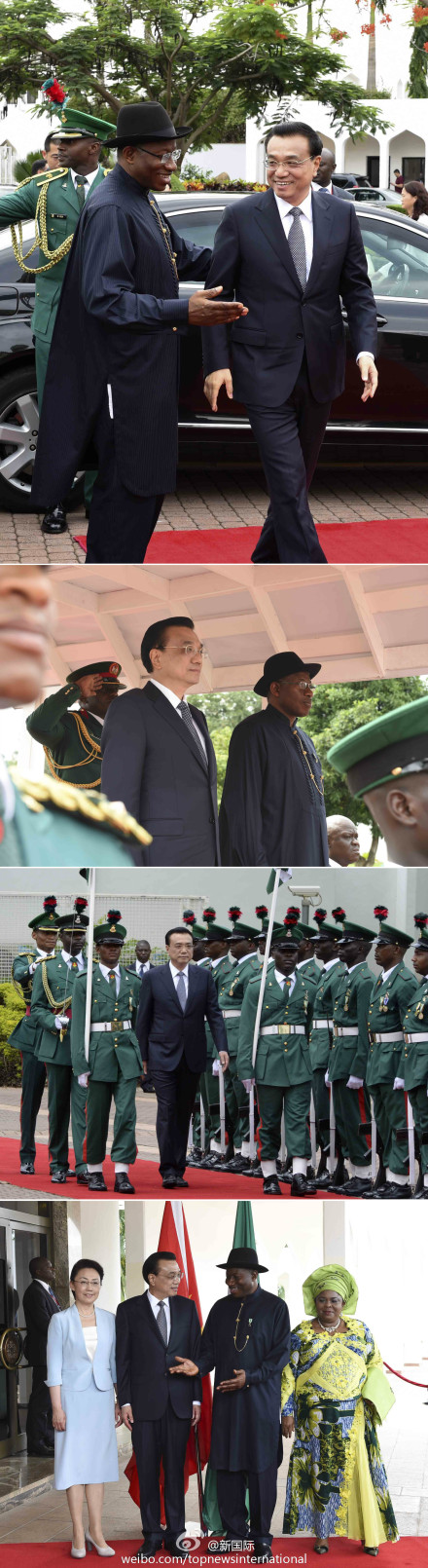 ??? 新華網(wǎng)北京5月7日電? 據(jù)新華社“新國際”微博報道,當(dāng)?shù)貢r間7日上午,尼日利亞總統(tǒng)喬納森在總統(tǒng)府為李克強(qiáng)總理舉行隆重歡迎儀式,現(xiàn)場鳴響禮炮,軍樂隊(duì)奏兩國國歌,李克強(qiáng)檢閱了儀仗隊(duì)。