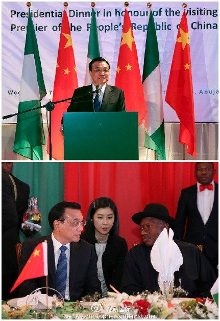 ??? 新華網北京5月8日電? 據新華社“新國際”微博報道,當地時間7日晚,尼日利亞總統喬納森夫婦在總統府為李克強總理和夫人程虹舉行隆重歡迎宴會。現場尼方兩次奏響中國國歌,感謝李克強在尼安全局勢嚴峻時刻“冒險”訪問,感謝中方對尼的巨大支持。