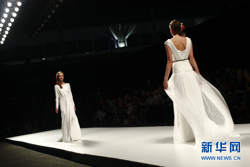 模特在T臺(tái)上展示西班牙品牌Victorio & Lucchino的婚紗。Victorio & Lucchino是來(lái)自西班牙塞維亞 (Sevilla)的兩位男服裝設(shè)計(jì)師的名字,Victorio和Lucchino同時(shí)也是西班牙本土知名時(shí)裝設(shè)計(jì)師組合之一。