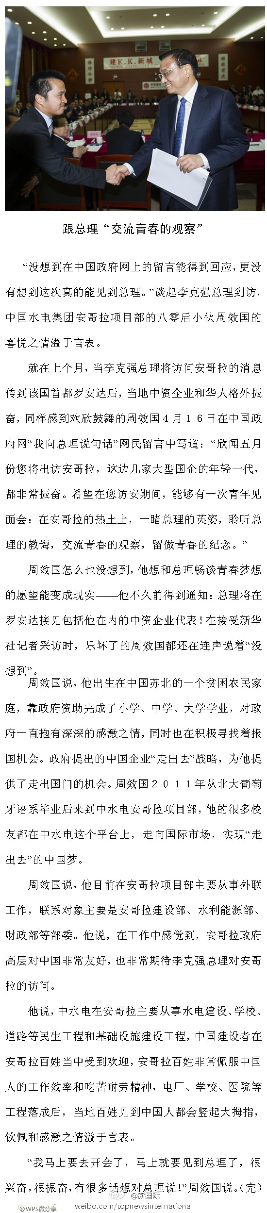 ??? 新華網(wǎng)北京5月9日電 據(jù)新華社“新國際”微博報道,80后的周效國2011年大學(xué)畢業(yè)后,被派往中水電安哥拉項目部工作。不久前獲知李總理將訪安,他在中國政府網(wǎng)給總理留言,希望與總理“交流青春的觀察”。8日,李克強(qiáng)在安主持召開海外民生座談會,周效國夢想成真,受邀參加并作了發(fā)言。詳情請戳長微。