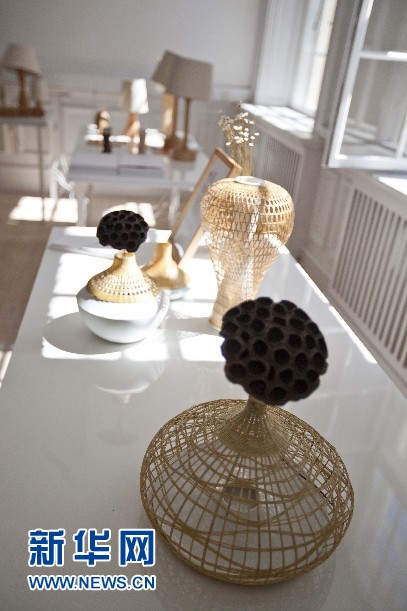 圖為10日所拍攝的“融?工藝設計生活”設計展上用竹條編織的花瓶。
