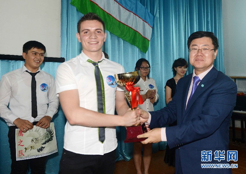 ????新華社塔什干6月9日電(記者沙達提)為慶祝中烏建交22周年,增進兩國間了解與交流,由中國駐烏茲別克斯坦使館主辦、烏茲別克斯坦世界語言大學承辦、塔什干孔子學院協辦的“長青杯”第一屆中烏知識競賽9日在烏茲別克斯坦語言大學隆重舉行。中國駐烏茲別克斯坦大使孫立杰、烏世界語言大學校長卡尤莫夫出席頒獎儀式并致辭。