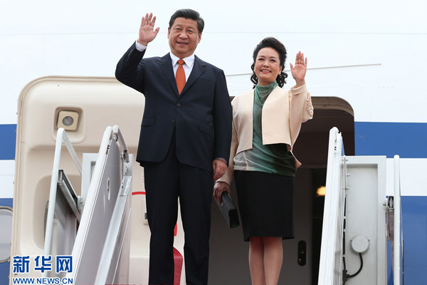 ??? 7月3日,國家主席習近平抵達首爾,開始對韓國進行國事訪問。這是習近平和夫人彭麗媛走出機艙。 新華社記者 蘭紅光 攝