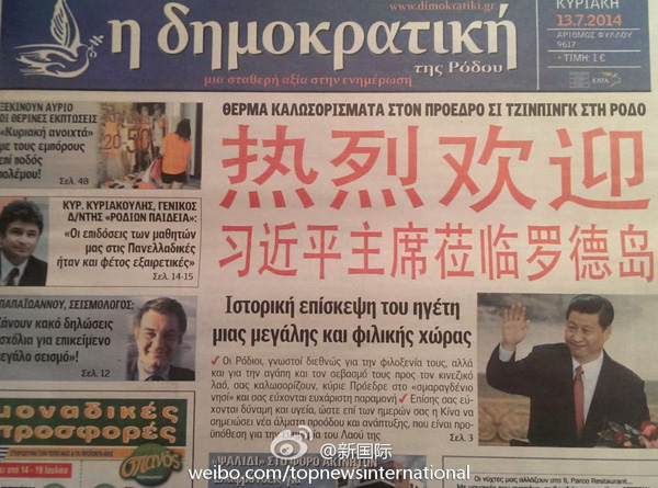 ????新華網(wǎng)北京7月14日電 據(jù)新華社“新國(guó)際”微博報(bào)道,希臘羅德島報(bào)紙《民主報(bào)》13日在頭版發(fā)表題為《一個(gè)偉大友好國(guó)家領(lǐng)導(dǎo)人的歷史性訪問(wèn)》文章,并用中文紅色大字體寫著“熱烈歡迎習(xí)近平主席蒞臨羅德島”。文章說(shuō),熱情好客的羅德島人民祝愿習(xí)近平主席身體健康,祝愿中國(guó)在習(xí)主席領(lǐng)導(dǎo)下取得跨越式發(fā)展,祝愿中國(guó)繁榮昌盛。