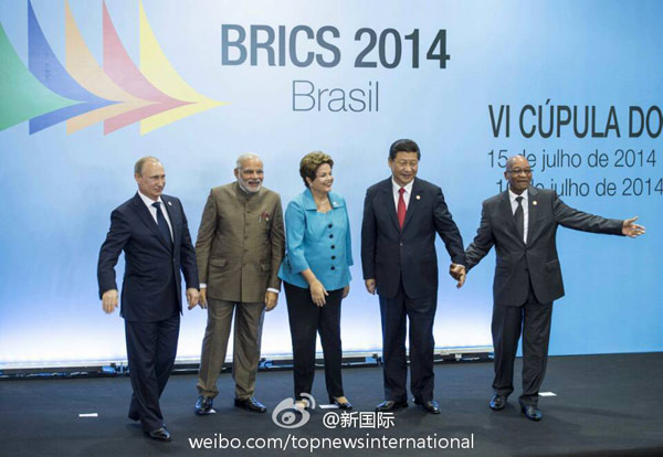 ???? 新華網北京7月16日電 據新華社“新國際”微博報道,習近平在出席金磚國家領導人第六次會晤時提出,要發揚金磚國家獨特的“開放、包容、合作、共贏”的合作伙伴精神,要堅定不移推動經濟可持續增長,堅定不移形成全方位經濟合作,堅定不移塑造有利外部發展環境,堅定不移提高道義感召力。