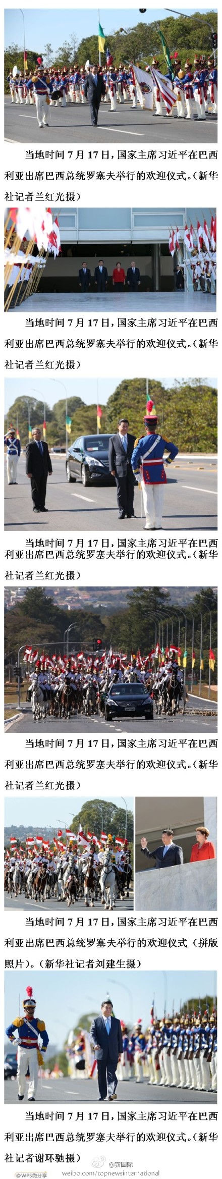 ????新華網(wǎng)北京7月18日電 據(jù)新華社“新國際”微博報道,17日,巴西總統(tǒng)羅塞夫為習近平舉行隆重歡迎儀式。在總統(tǒng)府入口處,習近平與羅塞夫親切握手、問候。軍樂團奏中巴國歌,升中國國旗,鳴禮炮21響。隨后,兩位元首一同登上觀禮臺,觀看儀仗隊分列式。騎兵馬隊簇擁著軍旗,奔騰跳躍,奮蹄疾馳。?