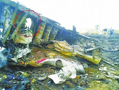 從這張殘骸照片來看,機身上有比臉盆略大的孔洞,破壞方向從機體外部沖向內(nèi)部,懷疑是導彈的戰(zhàn)斗部碎片擊中的一塊區(qū)域。