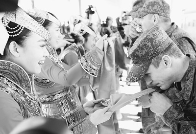 2014年8月16日,在內蒙古自治區朱日和訓練基地火車站,來自俄羅斯的參演實兵部隊官兵在歡迎儀式上接受蒙古族傳統迎賓禮。