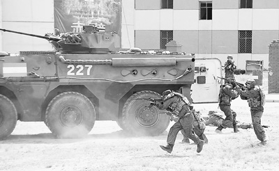 2014年8月21日,塔吉克斯坦參演部隊在“和平使命—2014”聯合反恐軍事演習前期聯合戰術協同訓練中包圍“恐怖分子”盤踞地。