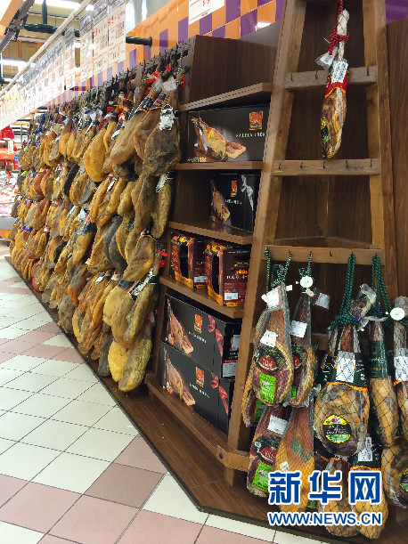 西班牙巴塞羅那一家超市里出售的整只火腿。