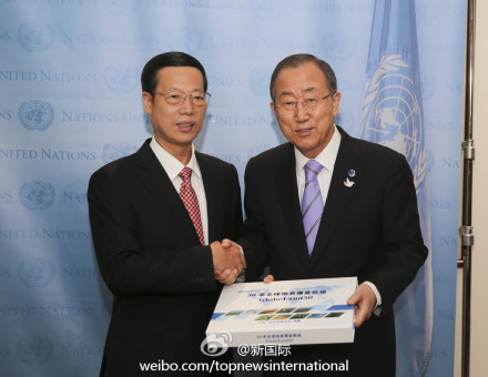 ????新華網北京9月23日電 據新華社“新國際”微博報道,國家主席習近平特使、國務院副總理張高麗22日在聯合國總部與聯合國秘書長潘基文共同出席中國政府向聯合國捐贈30米分辨率全球地表覆蓋數據儀式。張高麗表示,中國政府正式將世界上首套30米分辨率全球地表覆蓋數據捐贈給聯合國,這是為即將舉行的氣候峰會帶來的一份禮物。