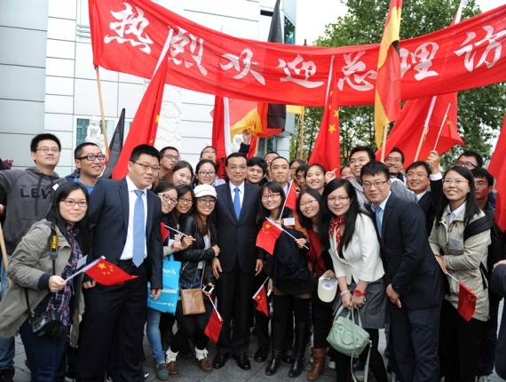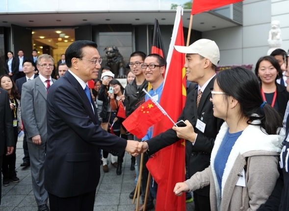 使館主樓外,還有不少中國留學(xué)生。他們打著“歡迎總理訪德”的橫幅,揮舞著中德兩國的國旗。見到克強(qiáng)總理走來,他們一下子圍了上去,爭(zhēng)相與克強(qiáng)總理握手。