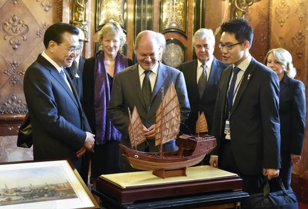 “這是一艘明代的商船,它曾到過非洲的東海岸,可惜沒能來到漢堡,不過它眺望過漢堡,現(xiàn)在終于來到漢堡了,”克強(qiáng)總理說。肖爾茨贈給克強(qiáng)總理的是一幅描繪漢堡市中心風(fēng)景的圖畫。