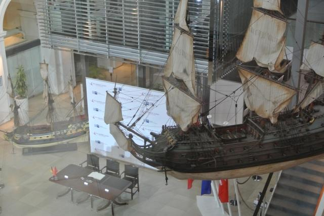 在中歐論壇漢堡峰會第六屆會議的舉行地漢堡商會的簽字大廳里,放著一艘帆船模型。天花板上也懸掛了很多船只模型。