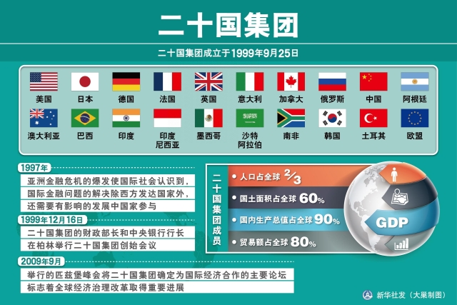 ?。牵玻暗漠a生與發展,與金融危機密不可分。1997年的亞洲金融風暴,使七國集團認識到與新興經濟體加強對話的重要性,并在兩年后倡議成立了這一組織,但在當時只限于財長和央行行長的非正式論壇。在2008年國際金融危機爆發后,此對話機制迅速升級為領導人的峰會,以加強各國的宏觀政策協調,應對全球性的金融危機。