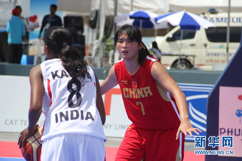??? 11月16日,中國沙灘籃球運動員黃銀婷(右)在比賽中。中國體育代表團16日在泰國普吉舉行的第四屆亞洲沙灘運動會上勇奪2枚金牌和2枚銅牌。當天比賽全部結束時,中國隊以3金2銀5銅的成績暫列獎牌榜第五。新華社發(塔納攝)
