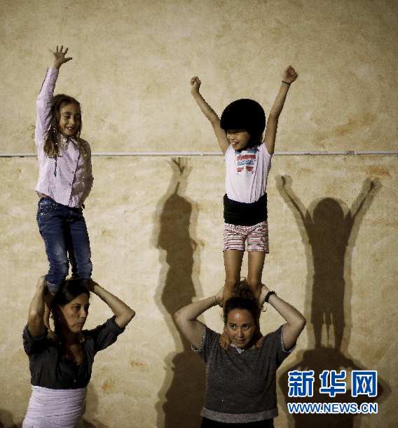 ????Jana(右上)踩在養母Thais(右下)肩上進行最基本的“疊人塔”訓練。新華社巴塞羅那分社攝影師Pau Barrena 攝