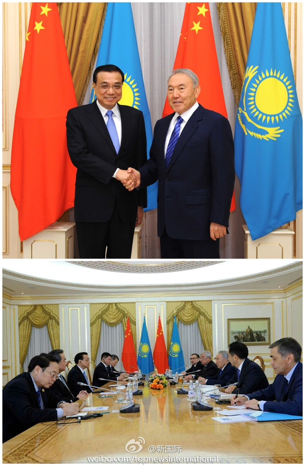 ????新華網北京12月15日電? 據新華社“新國際”微博報道,哈薩克斯坦總統(tǒng)納扎爾巴耶夫一般不在周末會客。可是為了歡迎遠道而來的中國總理,他打破了自己的慣例,于當地時間14日(周日)下午5點,在阿斯塔納總統(tǒng)府三層金廳高規(guī)格接待了首次訪哈的李克強總理,兩人同聲傳譯足足談了一個半小時。