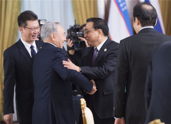 ????(納扎爾巴耶夫總統在集體會見上合組織成員國總理、秘書長和地區反恐機構執委會主任時,與克強總理相談甚歡,攝影記者:黃敬文)