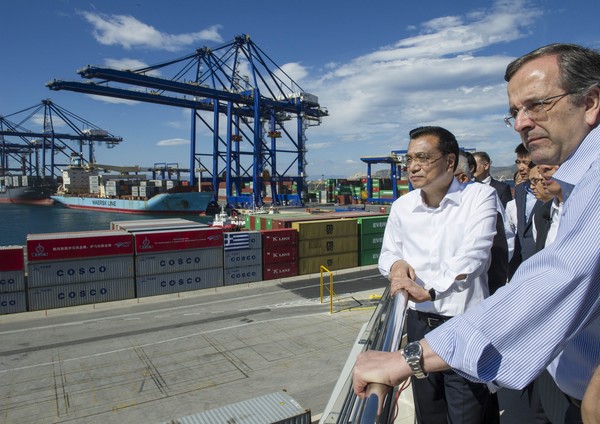 (6月20日,克強總理與希臘總理薩馬拉斯共同考察中國遠洋運輸集團比雷埃夫斯集裝箱碼頭,攝影記者:王曄 )