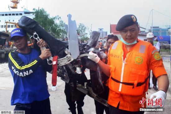 當地時間2015年1月19日,印尼加里曼丹,庫邁港,印尼國家搜救機構工作人員正抬著一個打撈上來的飛機座椅殘骸。