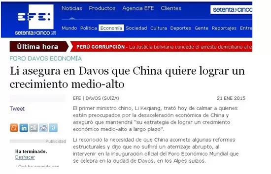 22日,西班牙埃菲社報道了李克強總理在達沃斯世界經濟論壇上的致辭,特別提到他就中國經濟增速放緩的回應。報道中引用李克強總理的話:“中國經濟進入新常態,經濟由高速增長轉為中高速增長。發展則必須由中低端水平邁向中高端水平,為此要堅定不移地推動結構性改革。”