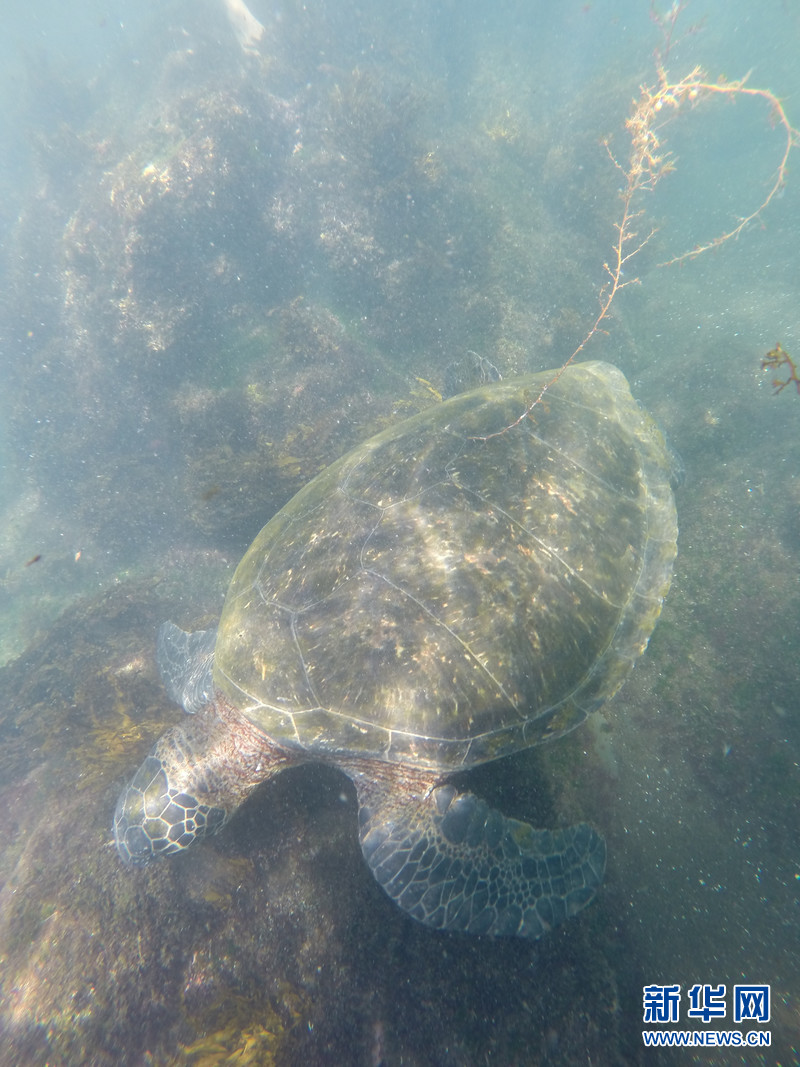 一只海龜在位于加拉帕戈斯群島東部的圣克里斯托巴(San Cristobal)島附近的海水中潛泳。