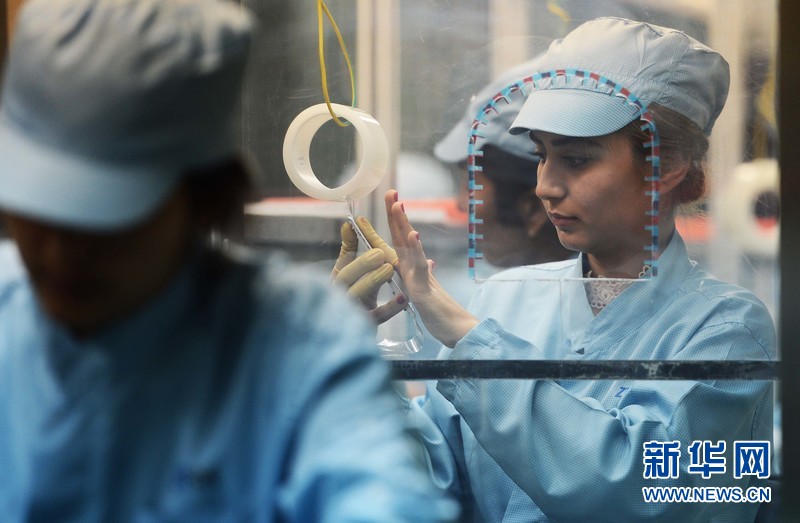 4月18日,在烏茲別克斯坦吉扎克工業(yè)特區(qū)錫爾河分區(qū)的鵬盛工業(yè)園區(qū),工人在鵬中興盛合資有限公司手機(jī)生產(chǎn)車(chē)間工作。新華社記者沙達(dá)提攝