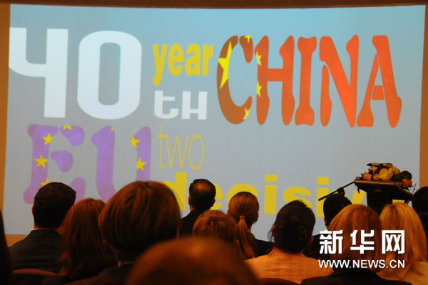 ??? 7月16日,第十屆歐洲外交官研討班開班儀式暨《中國歐盟建交40周年》紀(jì)念畫冊發(fā)行儀式在京舉行,圖為學(xué)員們觀看中國歐盟四十周年紀(jì)念短片。新華網(wǎng)記者 張藝 攝