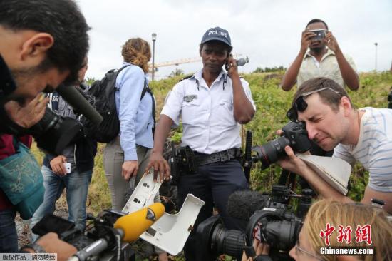 當地時間2015年8月4日,法屬留尼汪島圣但尼,警察在當地發現一塊塑料殘片。