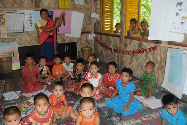 ↑2009年7月17日,孟加拉國東南部科格拉焦里縣,孩子們在聯合國兒童基金會支持的社區發展計劃下接受學前教育。(新華社記者黃亞男攝)