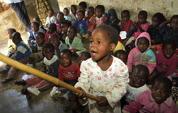這是2001年8月13日,艾滋病患兒坐在馬拉維布蘭太爾市郊的一個孤兒看護(hù)中心里上課。(新華社發(fā))