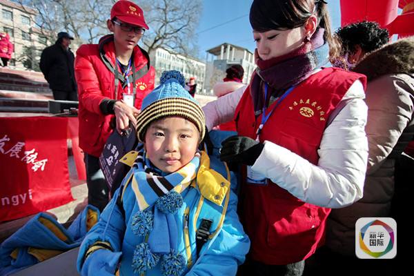 ????2015年12月21日,在甘肅平涼,志愿者給孩子穿上“壹基金溫暖包”內的防寒衣物。(楊昕攝影)