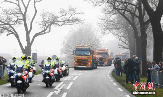 資料圖:當(dāng)?shù)貢r(shí)間2014年12月9日,運(yùn)送馬航MH17航班殘骸的卡車車隊(duì)定于抵達(dá)荷蘭南部的希爾澤.賴恩空軍基地。接下來,空難調(diào)查人員將利用殘骸再次拼裝這架客機(jī),以期找出失事原因。