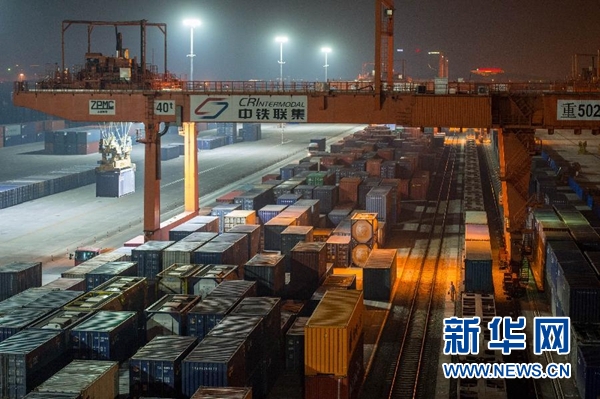 10月15日凌晨,在重慶鐵路口岸中鐵聯(lián)集重慶集裝箱中心站的作業(yè)區(qū),幾臺大型門吊在緊張地作業(yè),為第1000列中歐班列裝載出口到歐洲的貨物。當(dāng)日11時45分,載著筆記本電腦等51個集裝箱貨物的中歐班列,緩緩駛出重慶團結(jié)村站,駛向1.1萬公里之外的德國杜伊斯堡。這是第1000列往來中國和歐洲之間的國際貨運列車。新華社記者劉潺攝