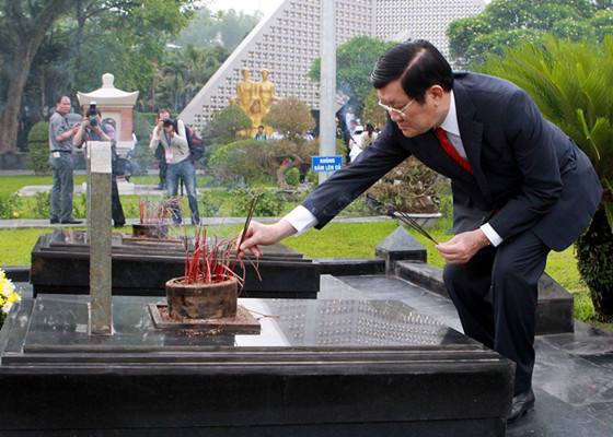 2014年5月7日,越南國家主席張晉創(chuàng)在奠邊府烈士陵園向烈士敬香。