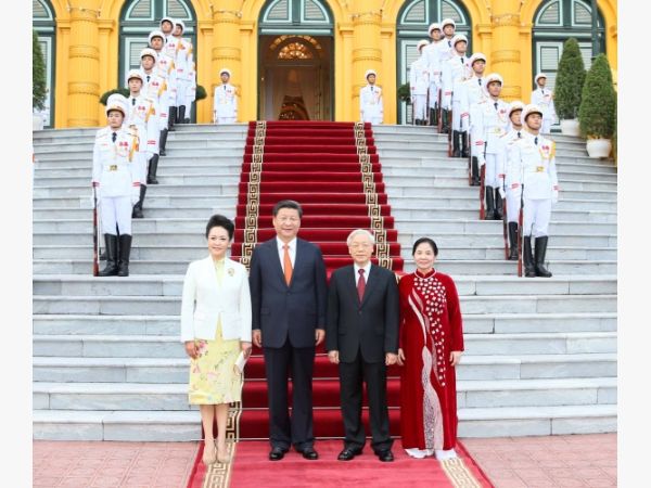 11月5日,中共中央總書記、國家主席習近平在河內同越共中央總書記阮富仲舉行會談。這是會談前,習近平出席阮富仲在主席府廣場舉行的盛大歡迎儀式。新華社記者蘭紅光攝