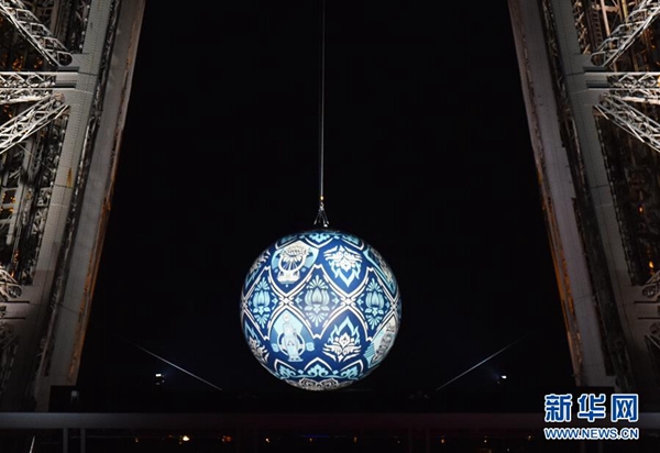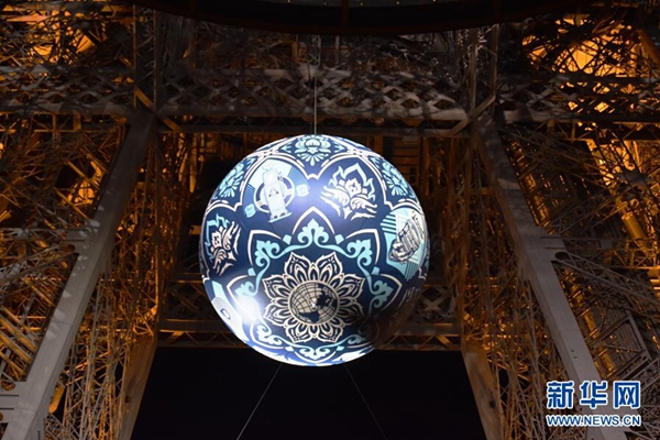 11月23日,在法國巴黎,一個(gè)名為“地球危機(jī)”的大圓球懸掛在埃菲爾鐵塔上。