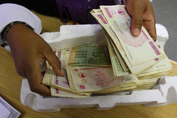 2015年6月15日,在首都哈拉雷一家銀行內,一名當地人拿著津元準備兌換美元。津巴布韋當日起回收不再流通的津巴布韋元,1張100萬億津元紙幣僅可兌換40美分。(新華社發)
