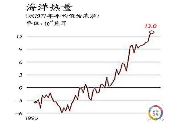 據美國獨立機構氣候總站統計,從1880年到2014年,海洋表面溫度每10年平均升高0.1華氏度。如果按照海洋儲存熱量的變化來看,以10的22次方焦耳為單位、1971年為基準,1955年海洋儲存熱量在負3個單位以下,2014年則超過13個單位。