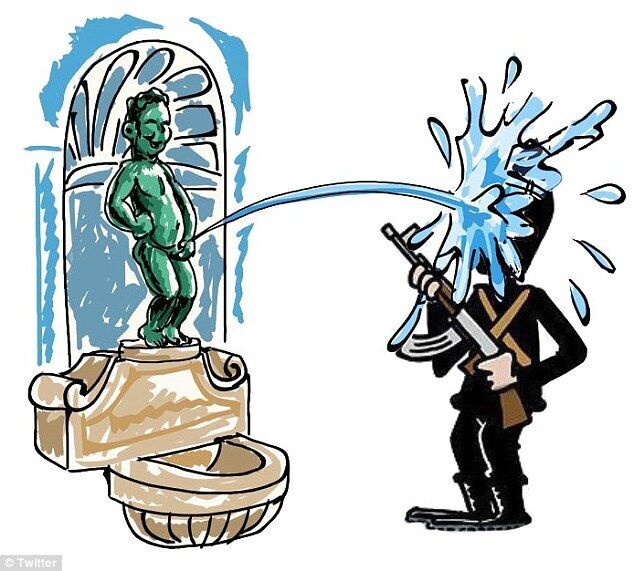 漫畫中,可愛的“撒尿小童”向代表恐怖主義的槍械和持槍者暢快地撒尿。也有網友將法國和比利時的國旗拼湊在一起,表達了同為恐襲受害國的法國與比利時站在一起,共同面對恐怖組織。