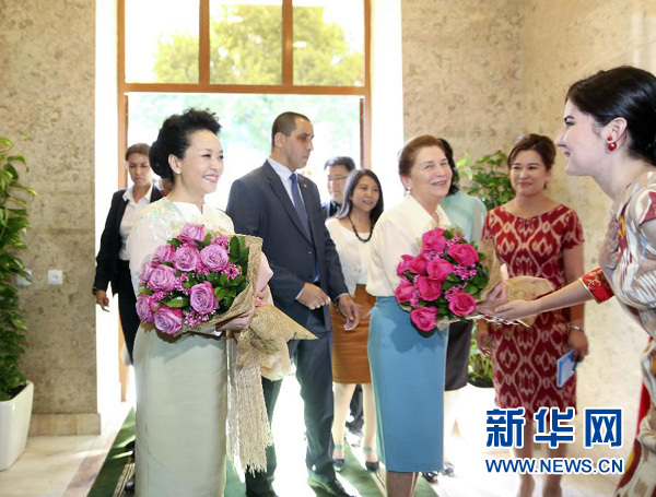 當地時間6月22日下午,國家主席習近平夫人彭麗媛同烏茲別克斯坦總統卡里莫夫夫人卡里莫娃共同參觀塔什干孔子學院。這是孔子學院學生向彭麗媛和卡里莫娃獻花。新華社記者丁林攝