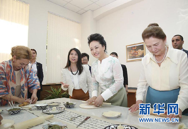 當地時間6月22日下午,國家主席習近平夫人彭麗媛同烏茲別克斯坦總統卡里莫夫夫人卡里莫娃共同參觀塔什干孔子學院。這是彭麗媛向學生們示范包餃子。新華社記者丁林攝