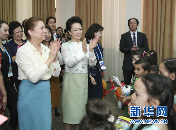 當地時間6月22日下午,國家主席習近平夫人彭麗媛同烏茲別克斯坦總統卡里莫夫夫人卡里莫娃共同參觀塔什干孔子學院。這是彭麗媛和卡里莫娃為參加演出的學生鼓掌。新華社記者丁林攝
