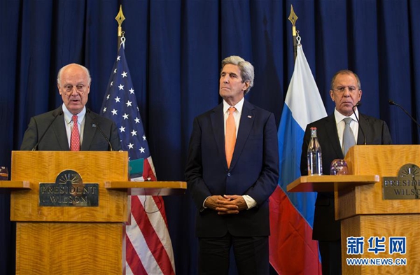 9月10日,在瑞士日內(nèi)瓦,美國(guó)國(guó)務(wù)卿克里(中)、俄羅斯外長(zhǎng)拉夫羅夫(右)和聯(lián)合國(guó)秘書(shū)長(zhǎng)敘利亞問(wèn)題特使德米斯圖拉出席聯(lián)合記者會(huì)。美國(guó)國(guó)務(wù)卿克里和俄羅斯外長(zhǎng)拉夫羅夫10日凌晨在日內(nèi)瓦就敘利亞停火協(xié)議達(dá)成一致,新的停火協(xié)議將于下周生效。 新華社記者 徐金泉 攝